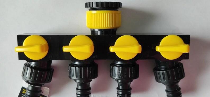Фитинг с четырьмя кранами для присоединения четырех шлангов к источнику воды. С одной стороны четыре штуцера для стандартных быстросоединителей, каждый со своим краном, с другой - внутренняя резьба 1", которая вкручена в резьбу 3/4" и может выкручиваться. При необходимости можно использовать нужный размер резьбы.