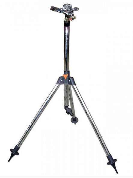 Металлический пульсирующий разбрызгиватель на штативе-треноге высотой 90см. Регулируемая дальность и сектор орошения. Поднятие оросителя на штатив увеличивает площадь полива, а также позволяет равномерно поливать высокие растения (например, грядки с овощными культурами). Имеет стандартный штуцер для быстросоединителей.